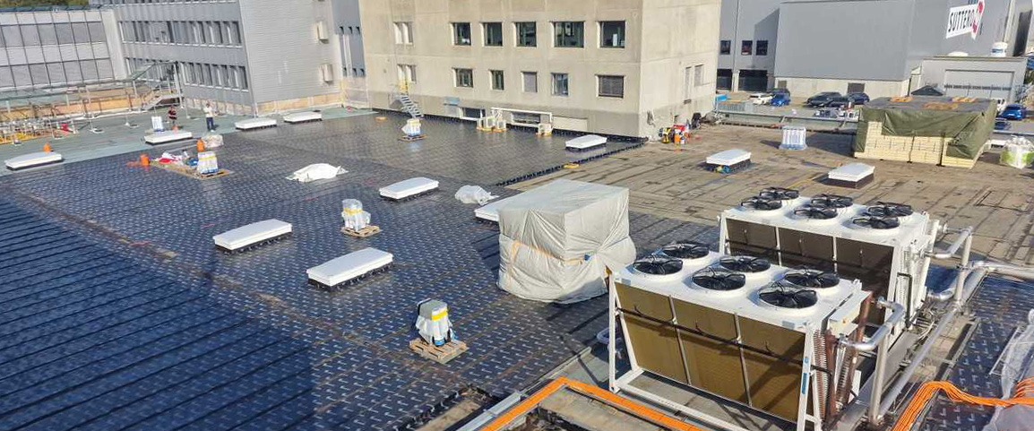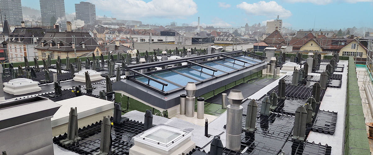 - Platzsparende Nutzung: Flachdächer können als erdüberdeckte Flächen bei Garagen und Einstellhallen, bekieste Dächer über Wohnhäusern oder Fabrikhallen sowie mit Platten- oder Steinbelag begehbare Bereiche gestaltet werden.